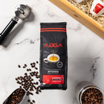 Our most popular blend across Quebec and Canada, Intenso is a dark roast espresso made from exceptional-quality coffee beans sourced from Costa Rica (SHB), Colombia, and two distinct origins in Africa and Asia. It delivers a bold, creamy, and full-bodied cup with notes of dark cocoa, roasted hazelnut, and a hint of smokiness.