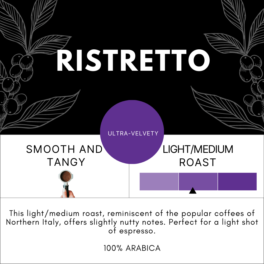 Inspired by the traditions of Northern Italy, Ristretto is a light roast espresso made from high-quality coffee beans sourced from Costa Rica (SHB), Colombia, and a renowned region of Asia known for its full body and deep aromatic profile. It delivers a balanced cup with smooth notes of hazelnut, mellow chocolate, and dried fruits.